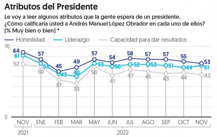 Aunque estos indicadores de atributos percibidos por la ciudadanía han tenido altibajos a lo largo de lo que va del sexenio, la imagen de honestidad del presidente ha sido su principal atributo, mientras que su capacidad para dar resultados ha sido su mayor debilidad.