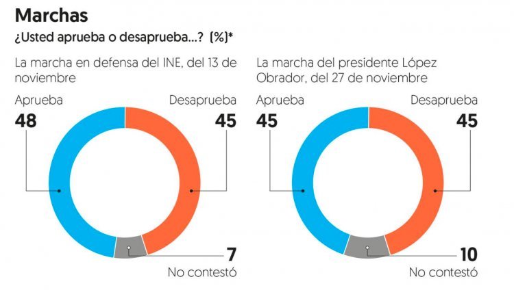 Al preguntar sobre las marchas que hubo el 13 y 27 de noviembre, la marcha ciudadana en defensa del Instituto Nacional Electoral (INE) registró 48% de aprobación y 45% de desaprobación, mientras que la marcha del presidente, dos semanas después, obtuvo 45% de apoyo y también 45% de rechazo.
