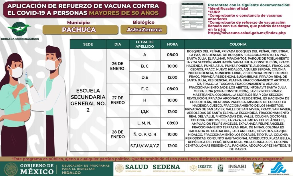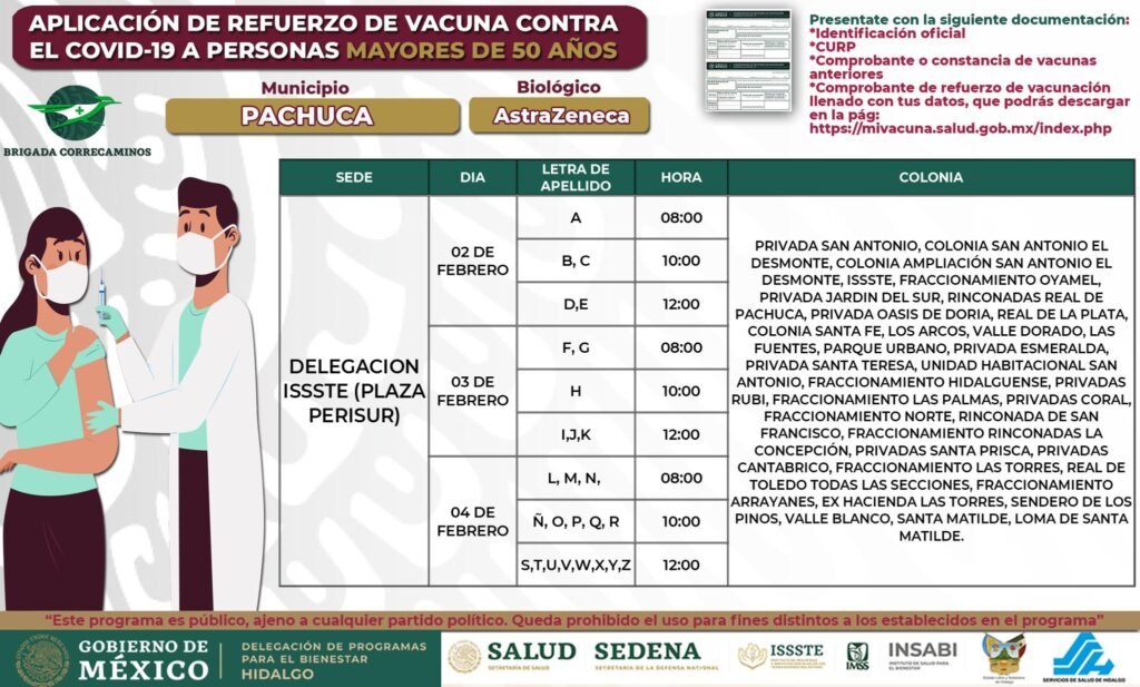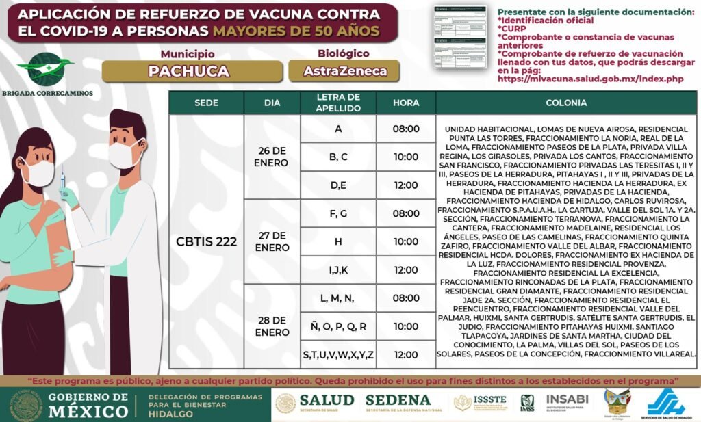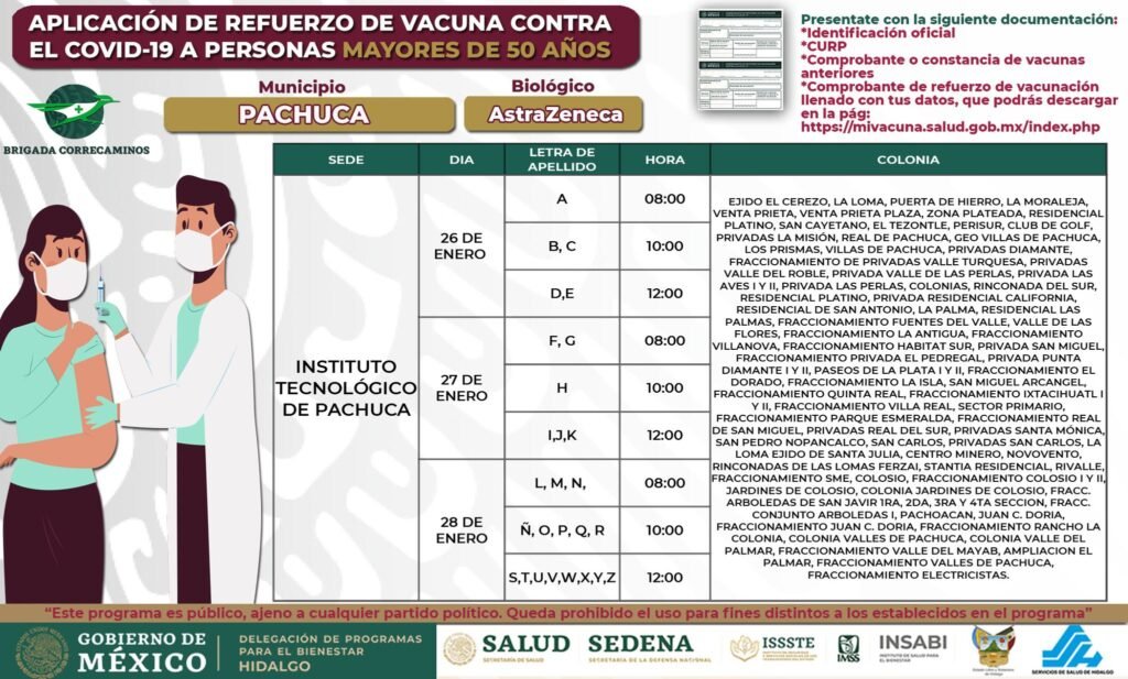 La Delegación de Programas para el Bienestar de Hidalgo dio a conocer las sedes de vacunación para el refuerzo de la vacuna Covid-19 para los adultos mayores de 50 años en Pachuca.