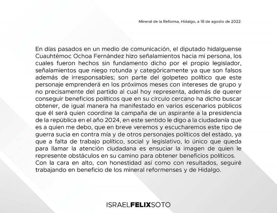 Israel Félix Soto, presidente municipal de Mineral de la Reforma, negó los señalamientos que hizo en su contra el diputado federal por Morena.