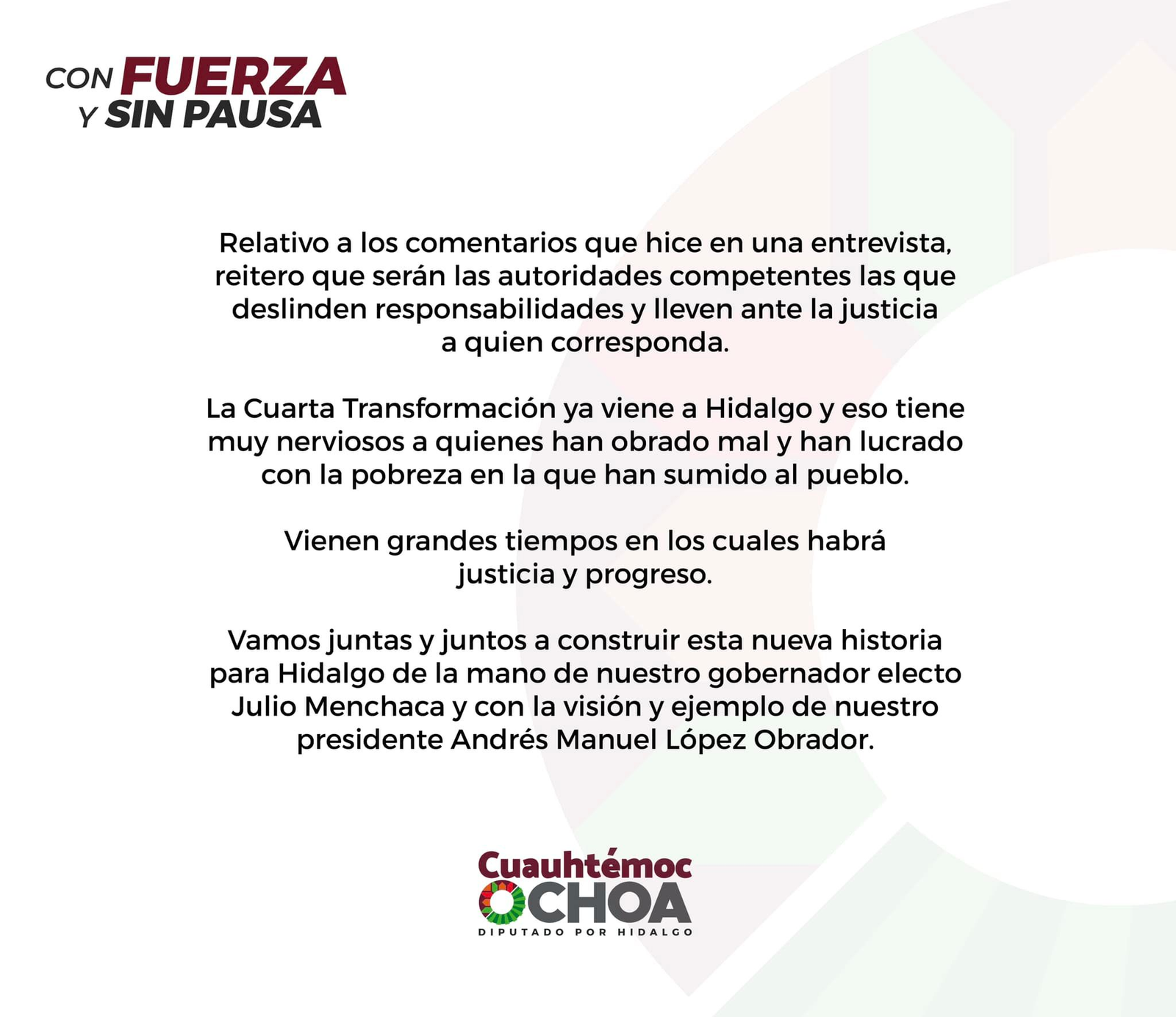 “En el caso del relleno sanitario de la comunidad del Cardonal en el municipio de Atitalaquia, existen redes de corrupción en las que está implicado César Mora, quien, en lugar de buscar las opciones de negociación entre la comunidad y las autoridades, sólo buscó mecanismos de negocio para seguir llenando sus bolsas de dinero”.