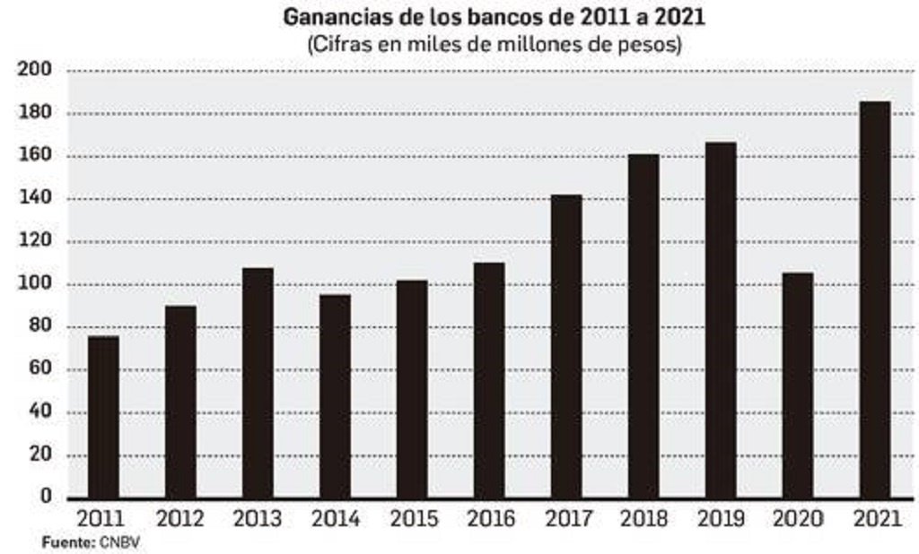 El conjunto de bancos que operan en el país obtuvo en 2021 utilidades por 182 mil millones de pesos, incremento de 65.7 por ciento con respecto a los 102 mil millones obtenidos en 2020.