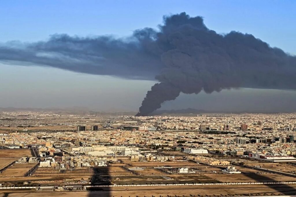 En Arabia Saudita,se eleva humo negro desde la ciudad portuaria de Yeda, en la costa saudita del Mar Rojo, donde el gigante petrolero Aramco tiene varias instalaciones.