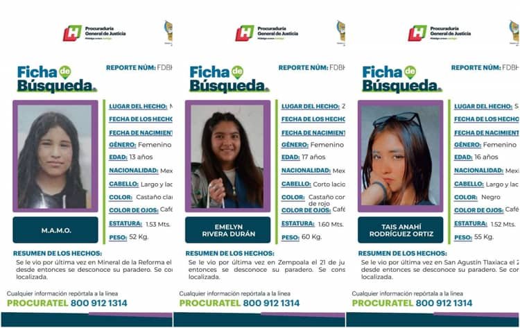 Ante los casos anteriores, la Procuraduría General de Justicia de Hidalgo exhortó a la población a compartir cualquier información sobre el paradero de las personas descritas arriba y ello puede hacerse al 800 912 1314.