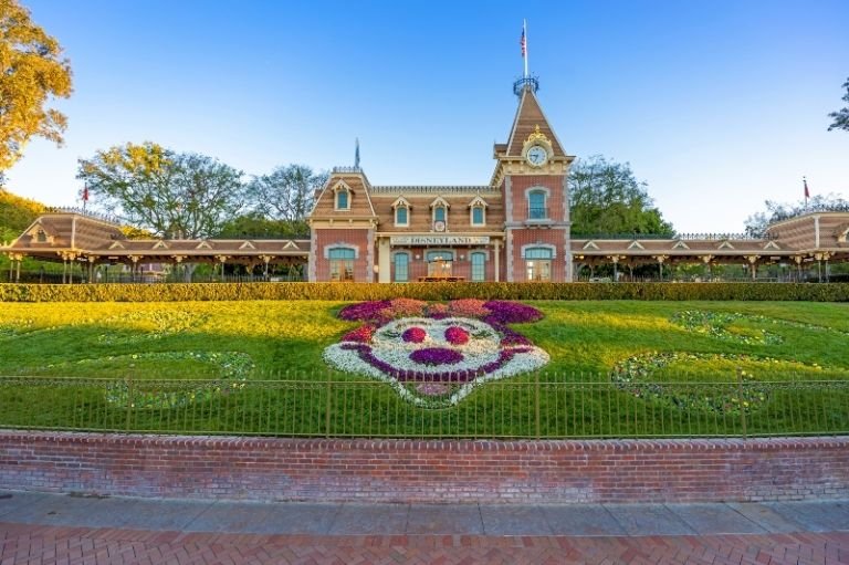 Floral Minnie se exhibirá en la ladera justo dentro de la entrada principal, frente a la estación Main Street, USA Disneyland Railroad .