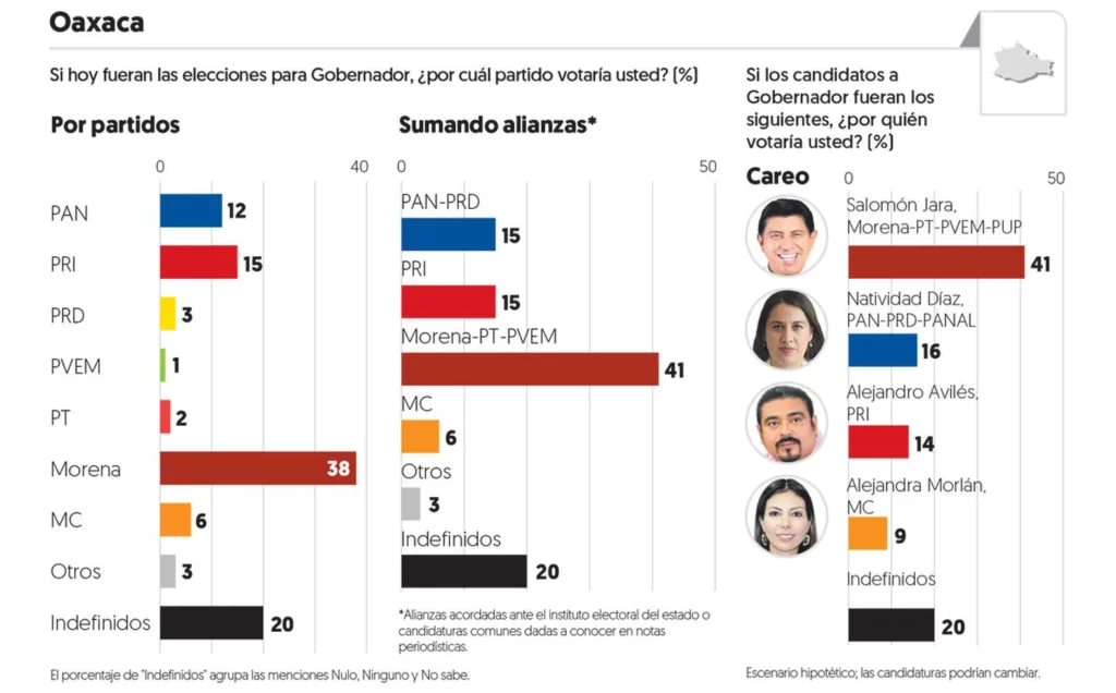 En Oaxaca, el partido del presidente Andrés Manuel López Obrador registra un apoyo de 41 por ciento, sumando a sus aliados PT y PVEM.