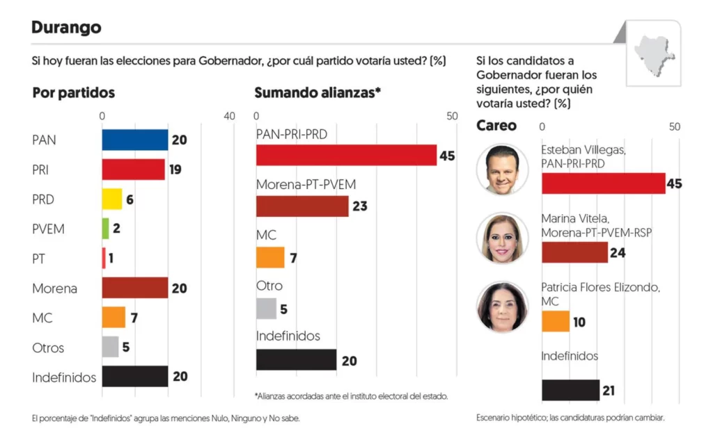 En Durango, PAN, PRI y Morena captan cada uno una quinta parte de las preferencias, alrededor de 20 por ciento, pero la alianza PAN-PRI y PRD obtiene 45 por ciento.