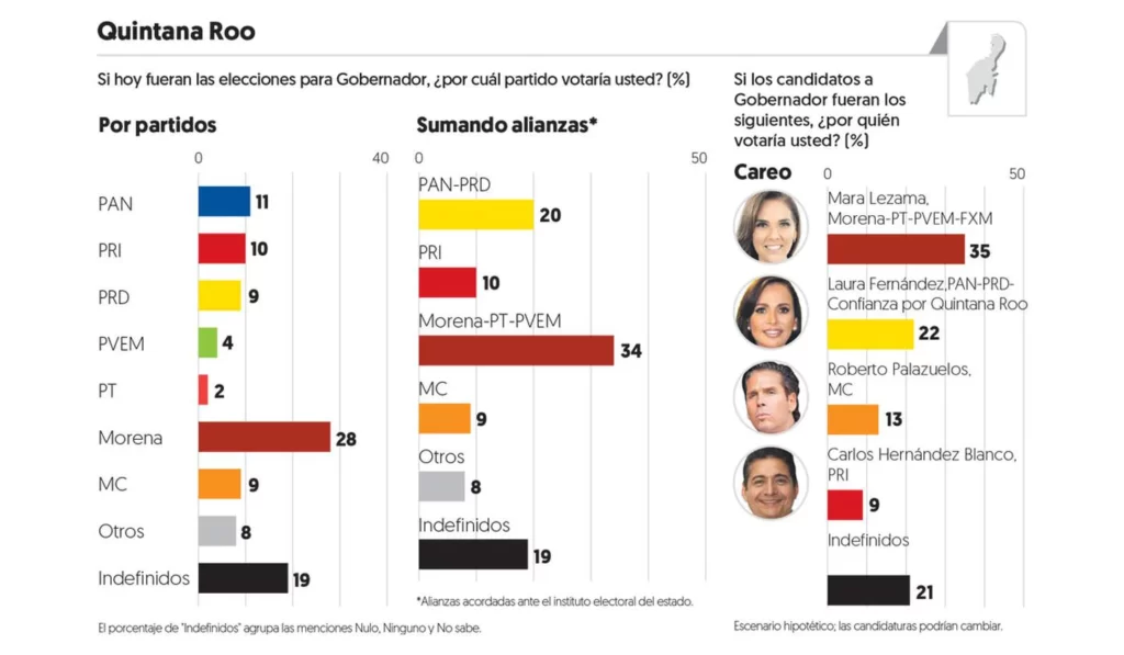 En Quintana Roo, Morena y sus aliados suman por lo menos 35 por ciento de las preferencias, 13 puntos por encima de la alianza PAN-PRD y Confianza por Quintana Roo, una organización local.