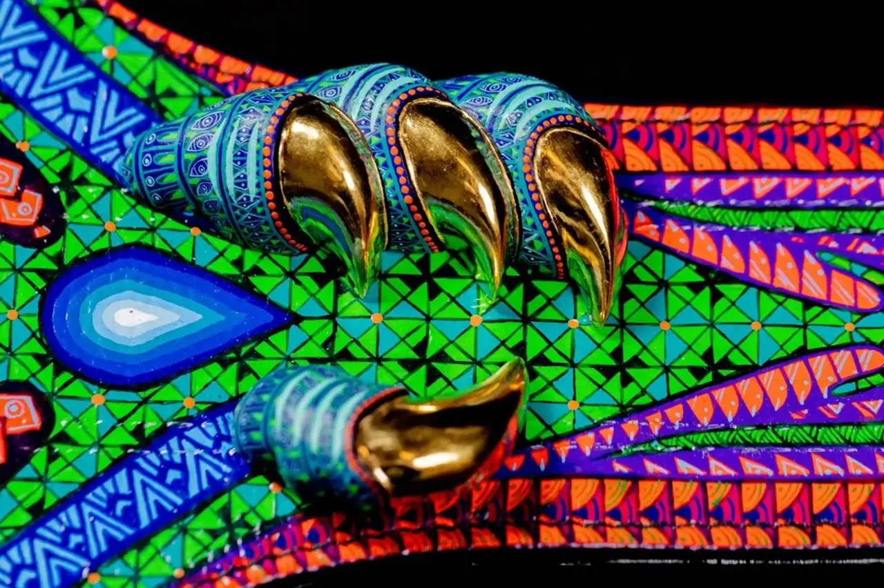 El también denominado ‘Cinturón Guerrero Jaguar’ fue elaborado durante un mes por el taller Jacobo y María Ángeles de San Martín Tilcajete, municipio de Oaxaca, y pintado a mano.